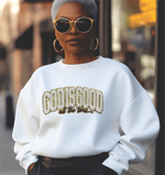 Ladies cut cotton blend T-shirt & UNISEX Sweatshirt for a soft luxurious feel. The chenille patch is trimmed in metallic gold for a rich vibrant faith-based statement.